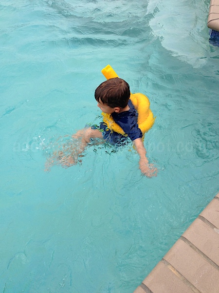 Put away the puddle jumpers and arm floaties. Simply tie a noodle tightly under your kiddo's armpits and watch him maneuver through the water much more seamlessly. This frees up their arms and gives them a bit more control in the water.